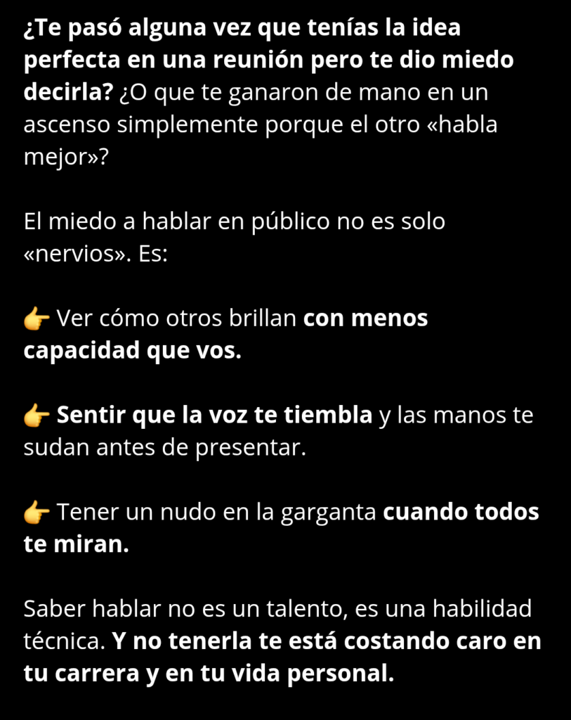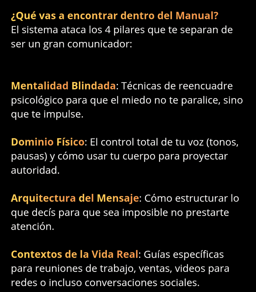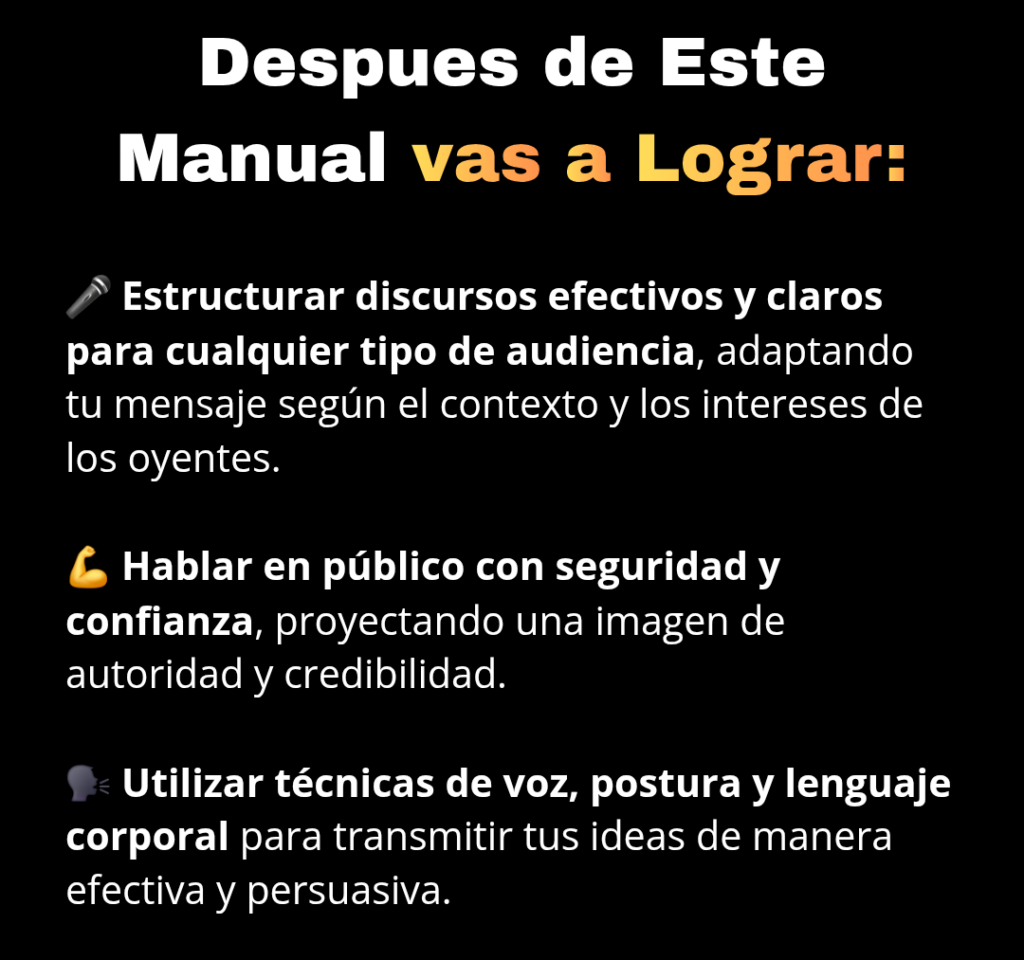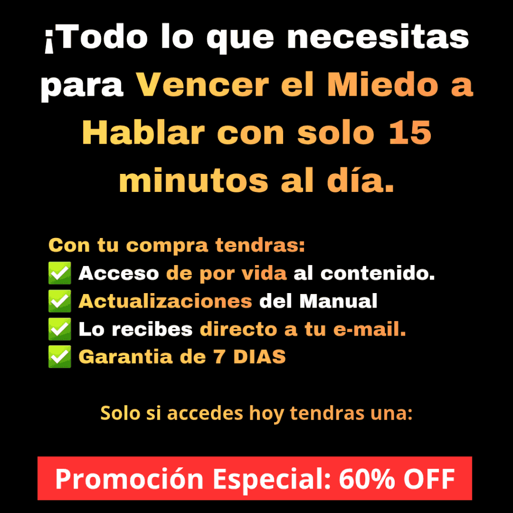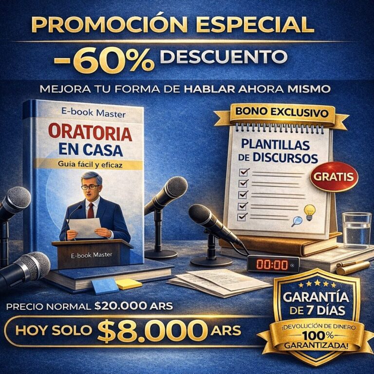 No tengo experiencia previa y me da mucha vergüenza, ¿es para mí? Totalmente. De hecho, el manual empieza desde cero, ayudándote a gestionar el miedo antes de pasar a las técnicas de habla. Está pensado para quienes sienten que se bloquean al ser el centro de atención.